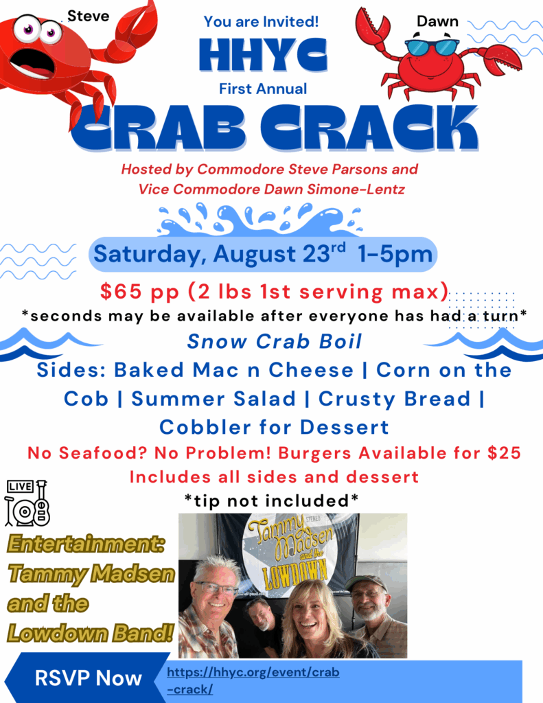 Join us for our first annual HHYC Crab Crack hosted by Commodore Steve Parsons and Vice Commodore Dawn Simone-Lentz! RSVP on the form below and for more details check out the flyer below.