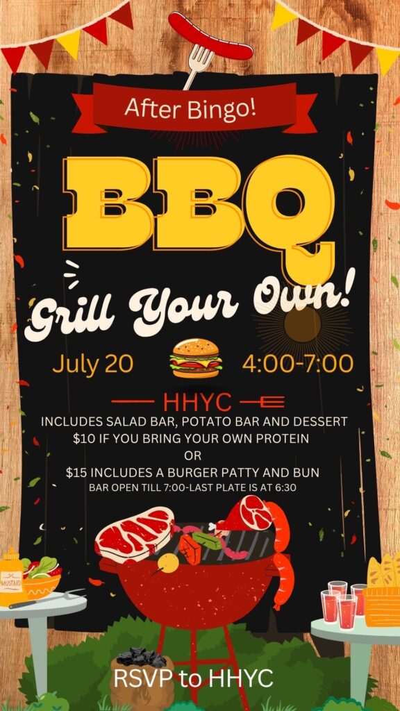 Join us for Bingo and a “Grill Your Own” BBQ! Details listed on the flyers below, RSVP required for the “Grill Your Own” event. Please RSVP by July 18th.