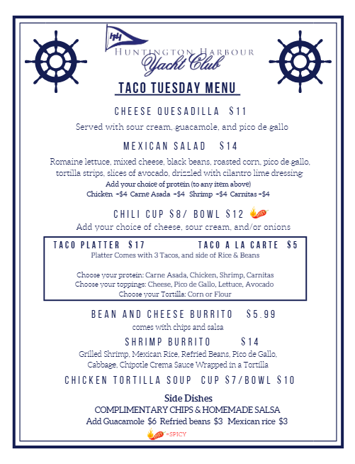 | Taco Tuesday in the Commodore’s Lounge! Open 4:30pm-9:00pm Food Served 5:00pm-8:00pm |